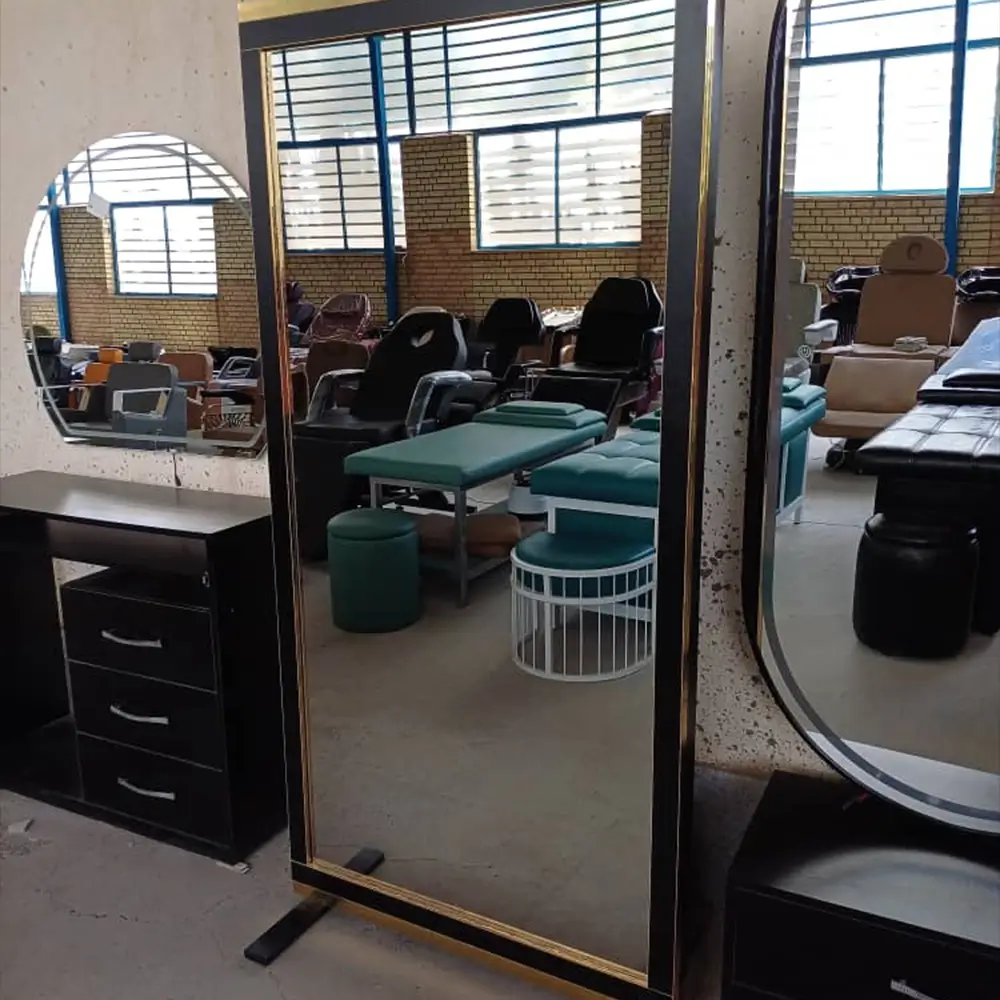 آینه ایستاده LED متحرک با بدنه آهن و MDF برای سالنهای حرفهای طراحی شده و با قابلیت جابجایی و نور LED، تجربهای راحت و دقیق برای آرایشگر و مشتری فراهم میکند.